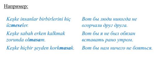 Используя данный аффикс можно выразить желание, чтобы действие, называемое глаголом, было выполнено, но при этом вы знаете, что вряд ли это произойдет. Этот аффикс снабжается теми же личными аффиксами (-m, -n, -k, -niz, -ler), что и аффикс прошедшего времени -dı. Иногда фраза содержащая сослагательное наклонение, начинается со слова keşke (вот бы)