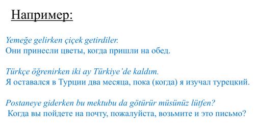 Türkçe öğrenirken iki ay Türkiyede kaldım — Я оставался в Турции два месяца, пока (когда) я изучал турецкий.