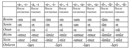 Каждому притяжательному местоимению соответствует свой аффикс принадлежности. Аффиксы принадлежности указывают на принадлежность какому-либо лицу.
