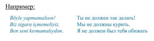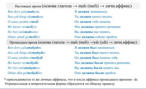 Прошедшее время: основа глагола + malıydı/meliydi +личный аффикс