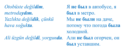 Отрицательная форма образуется при помощи слова değil. Değil получает аффикс -di, за которым следует личный аффикс