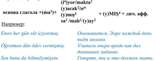 Глагольные временные аффиксы, а также аффиксы наклонений могут объединяться с субъективным прошедшим временем -(y)mış. При этом сохраняются основные значения: передача чужих слов, обнаружение отличия и т.д. Однако сочетание аффиксов dı(y)mış, именно в таком порядке, отсутствует.
