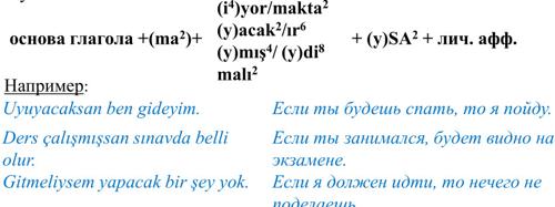 В условных придаточных предложениях глаголы в условном наклонении являются примером объединенных времен. Речь идет не только о сочетании стандартных временных аффиксов, но и аффиксов долженствовательного наклонения с аффиксом условного наклонения.