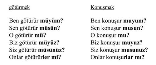 Вопросительная форма настоящего-будущего времени образуется с помощью вопросительной частицы mı (mi, mu, mü), следующей за основой настоящего-будущего времени и присоединяющей к себе аффиксы сказуемости