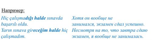 Yarın sınava gireceğim halde hiç çalışmadım — Несмотря на то, что завтра сдаю экзамен, я вообще не занималась.