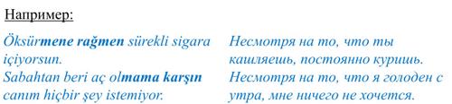 Противоречащие друг другу ситуации можно передать и оборотом, в составе которого есть отглагольное существительно на -ma с аффиксом принадлежности и дательного падежа -(n)a и одно из слов rağmen или karşın.