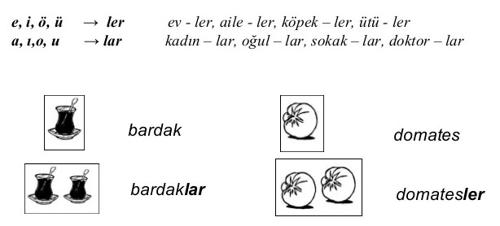 Для образования множественного числа к основе слова нужно присоединить ударный аффикс -lar, если последняя гласная основы является твердой или -ler, если последняя гласная основы мягкая