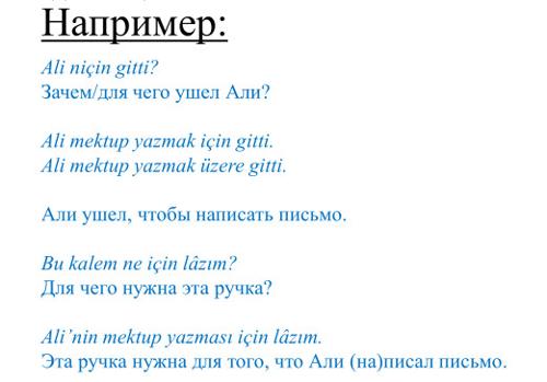 Помимо дательного падежа, обстоятельство цели передается формами -mak (-mek) için, -mak (-mek) üzere, -ması (-mesi) için.
