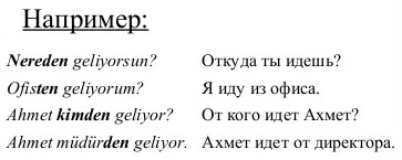 Образуется при помощи ударного аффикса -dan, (-den, -tan, -ten) и обозначает исходный пункт движения или действия. Отвечает на вопросы kimden? (от кого, из кого?), nereden? (откуда?), neden? (от чего, с чего?).