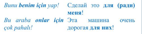 Послеслог için может выражать цель, причину, назначение. Как и любой послеслог ставится после слова, относительно которого используется.