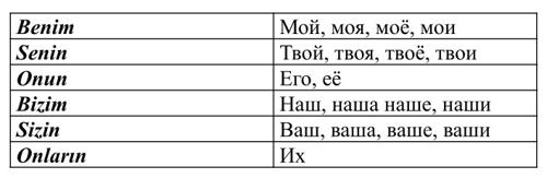 Притяжательные местоимения в турецком языке выполняют те же функции, что и соответствующие местоимения в русском языке, с той разницей, что для выражения принадлежности не всегда достаточно употребить только притяжательное местоимение. Для этого необходимо к слову, определяемому притяжательным местоимением прибавить еще аффикс принадлежности