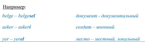 Этот аффикс образует от имен существительных относительные прилагательные. Ему подобные аффиксы турецкого языка -al, -i.