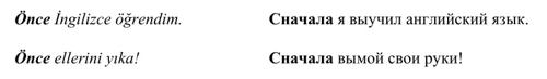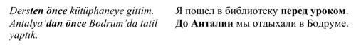 Форма -meden önce (-madan önce), присоединяемая к основе глагола в соответствии с законом гармонии гласных, используется для описания положения, которое существует до начала действия. Переводится такая конструкция как "прежде, чем", "перед тем, как".