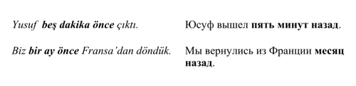 Слово , управляя именем в исходном падеже, соответствует русским предлогам "до" и "перед" в значении "раньше"