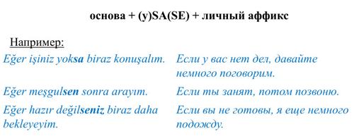 В условном наклонении могут быть, кроме глаголов, и другие части речи. Аффикс -(y)sa (se) с личным аффиксом добавляется к основам других имен, а также к отрицательной частице değil и таких слов как var/yok